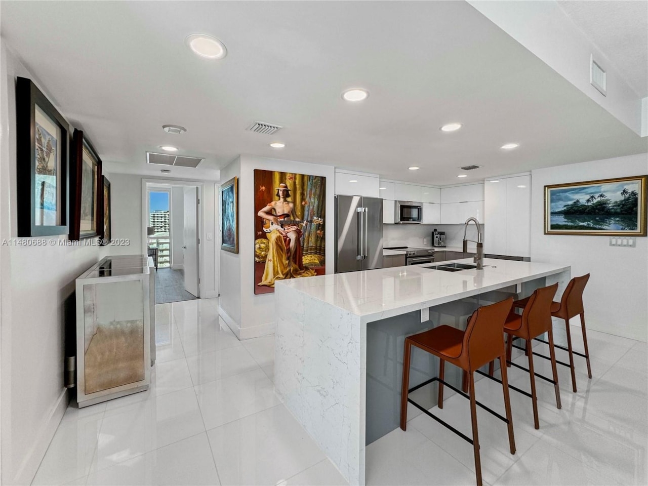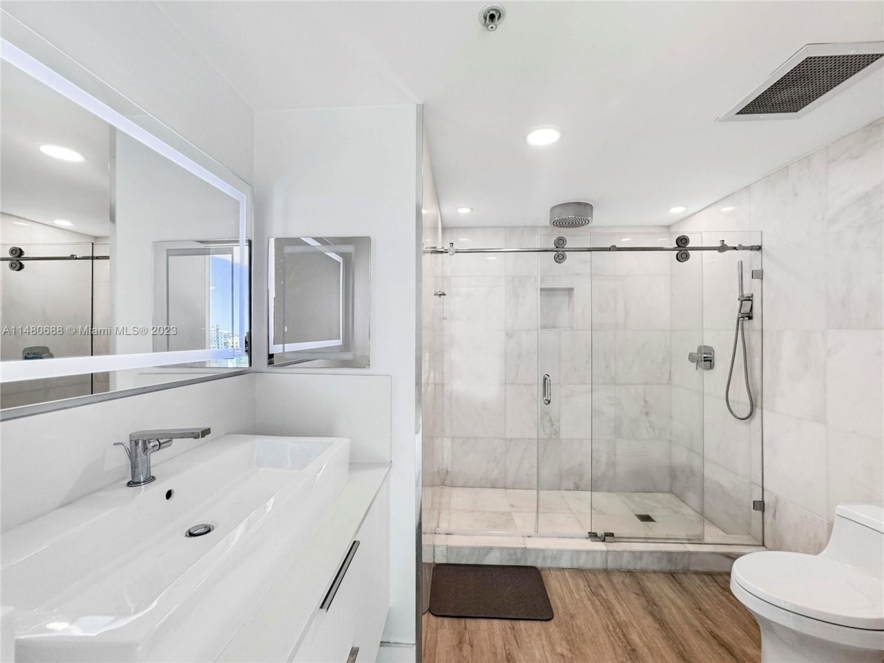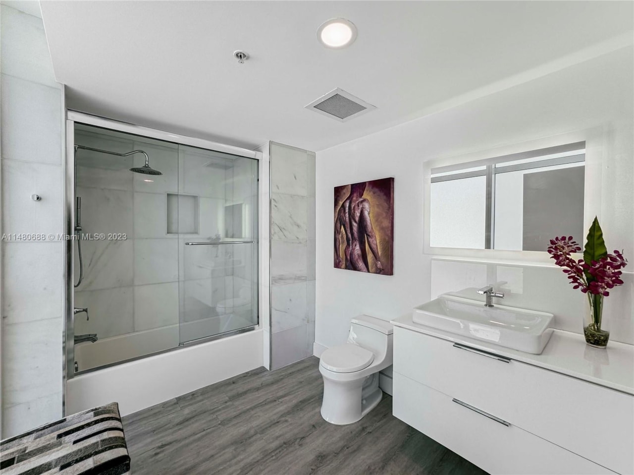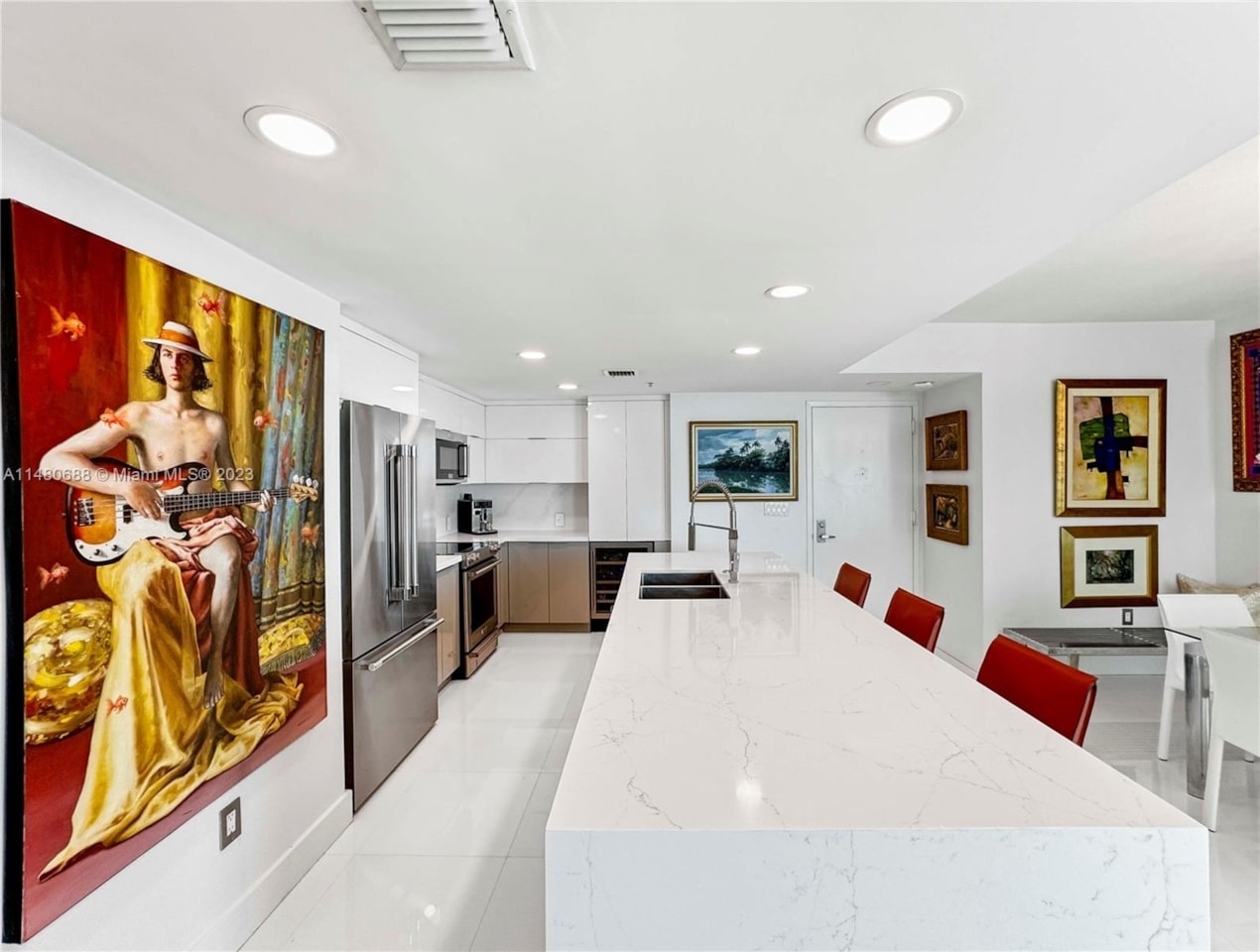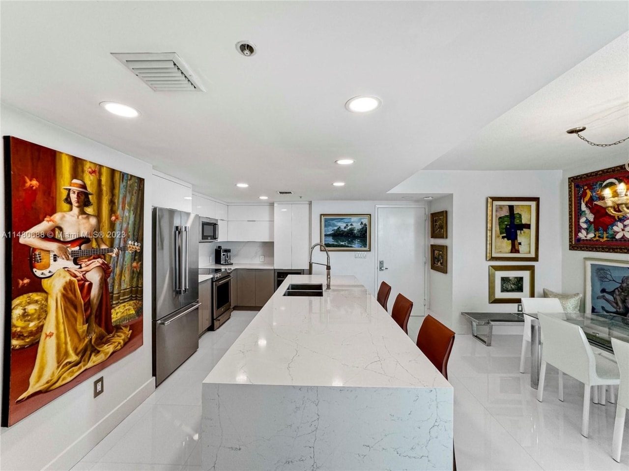 Welcome to Onyx on the Bay 1001, ultra-upgraded, luxury flow-thru, 2/2.5 perched over pristine Biscayne Bay. Unobstructed bay views; white porcelain & gray LVP floors; expansive kitchen w/Venatino quartz waterfall island & custom wood cabinets; waterfront great room; 2 large bedroom suites with private bathrooms, custom built walk-in closets; new A/C, whole home H20 filtration & automation- lighting, A/C, window treatments, & smoke/carbon monoxide detection; & a powder room.Floor-to-ceiling impact glass windows & doors open up to a 36 ft sunset balcony from one bedroom & a 30 ft sunrise balcony from the great room.Concierge; renovated infinity edge pool w/spa; sauna, steam, weight, yoga, & cardio; 8th floor pet area w/grills; party rooms; & billiards. 1 assigned + guest parking.